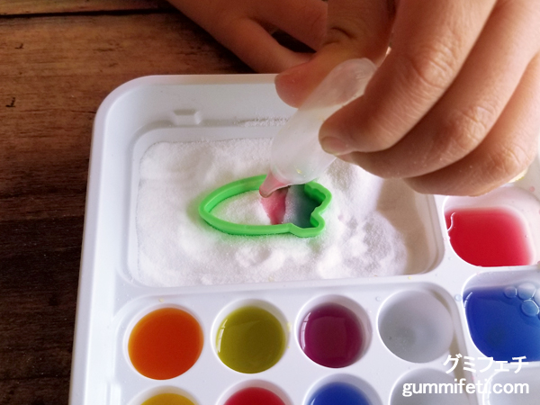 好きな型をグミのもとの上に乗せて、その型の中にスポイトでさっき作った色の液体を流し込みます。液体を流し込むと、グミのもとと混ざり合って固まりはじめめます。・・・っていうか、マジ息子、手大丈夫?疲れてる??