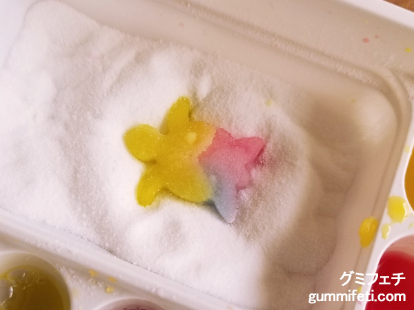 液体を流し込んだあと少し待ってグミが固まったらさっきのフォークを使ってそっと型から外します。そんなに難しくないです。6歳の息子でも全然できるレベル!最近スマホを操作する手が震えるアラフォーグミ助の方ができるかどうか怪しいくらい!ははは!(笑い事ではない)